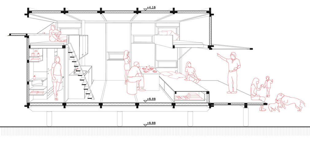 Cabin on the Border by SO? Architecture&Ideas exemplifies New Wood Open Architecture by integrating adaptable systems and active resident involvement. The cabin employs photovoltaic panels, rainwater collection tanks, and a wooden stove to support off-grid living. At the same time, its prefabricated design and modular construction can be considered soft systems, allowing for future reuse and customization. The project offers engagement to residents through manually foldable façade and operable windows, fostering a deep connection with the environment. The playful, active involvement defines the occupant's crucial role in the cabin's functionality and sustainability. The exposed structural design enhances aesthetic appeal and facilitates easy maintenance and repairs, making the cabin adaptable to various climatic conditions and suitable for potential temporary or emergency use. Cabin on the Border demonstrates New Wood Open Architecture by using wood and wood products to create a malleable and sustainable project.