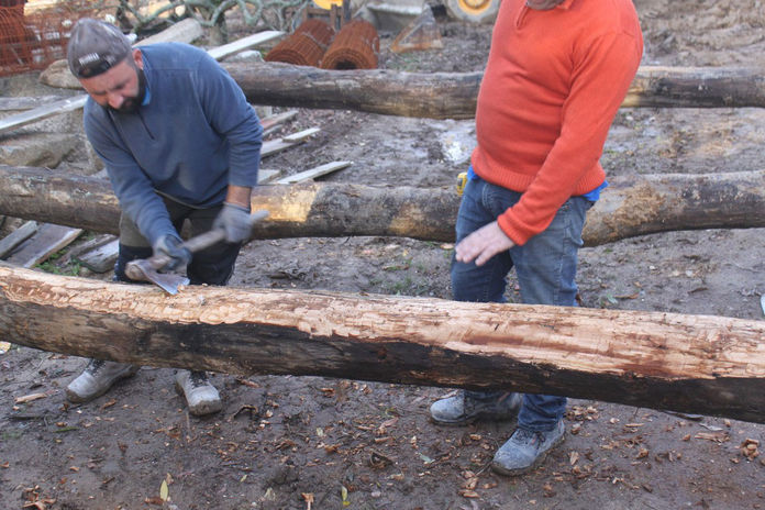 The project also displays an innovative application for natural wood structural members. Salvaged logs were used as the primary truss structure above the covered walkway and give the space unique character and warmth. This thinking shows how raw wood materials have architectural applications without necessitating the costly and carbon-intensive milling process. It uses the natural irregularities of the logs as a means of expression, highlighting its architectural impact over standard square-milled lumber.