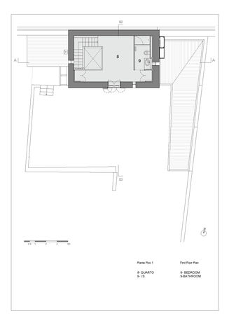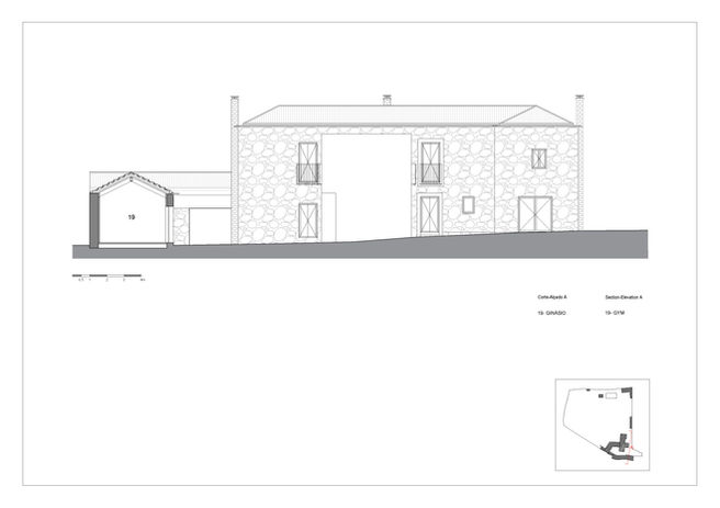 A similar layout applies to the guest house with a living room, dining room and kitchen on the ground floor, a bedroom a bathroom on the second floor. A changing room adjacent to the swimming pool with a bathroom and storage for garden maintenance tools find a place in an extension to the guest house.