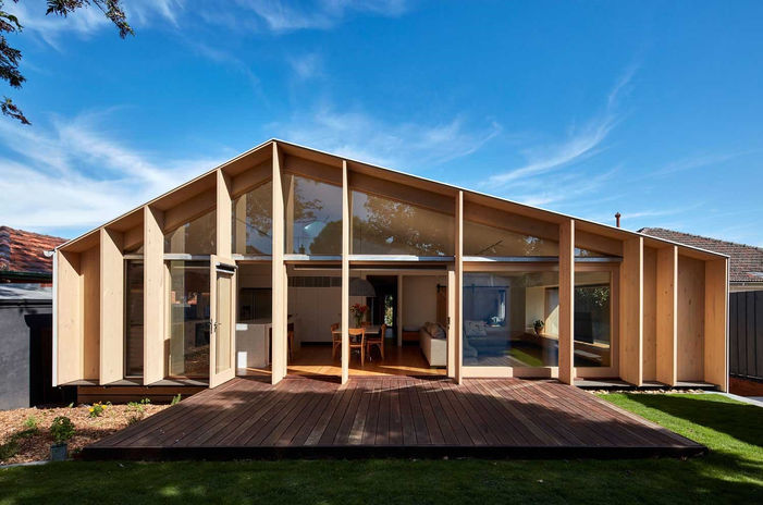 Two skillion roof forms were juxtaposed to create the living areas that span across the rear of the house and open to the garden. The resulting roof form provides a highly efficient building envelope: the surface area of the additions are around 12% less than if a flat roof / flat ceiling solution had been employed with the same built volume. This in turn translates to increased thermal efficiency and reduced capital consumption. An innovative structural system of laminated timber fins and beams was devised to support the form while simultaneously maintaining substantial glazing areas to the garden and providing sun shading.