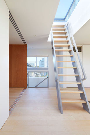The house is a dance studio on the ground floor, with a home above, yoga space on the roof. The design is primitive, almost cartoonish - a fitting approach for the clients, who design and sell a series of famously mysterious and unique dolls with a global following. Making full use of Tokyo's rules and regulations, the home maximizes space and volume on a typically constrained urban site, resulting in a simple plan - three single rooms stacked one upon the other.