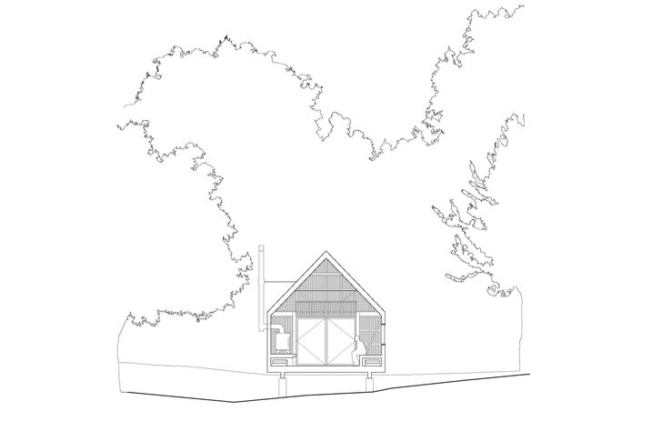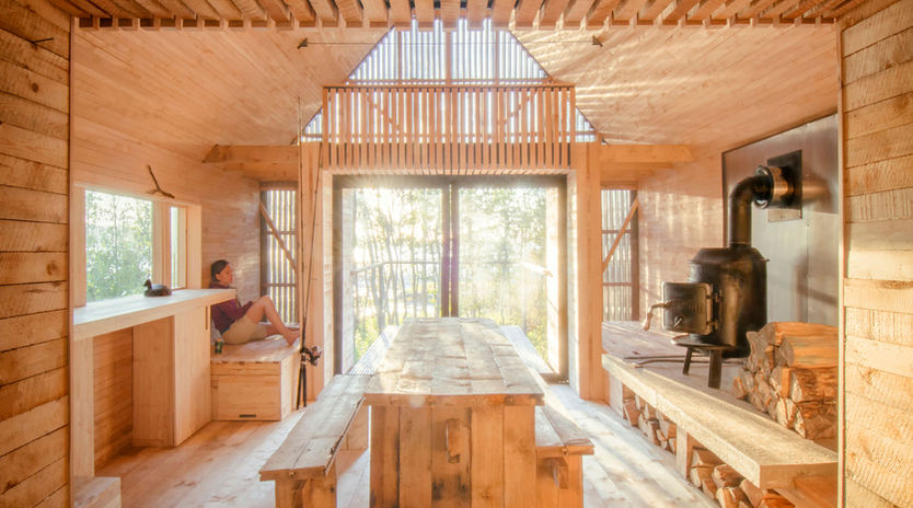 The project directives were two-fold: to create a shelter for local trail users and fishermen and to use the construction of the project as a learning tool for architecture students with little exposure to the processes and conditions of building. The users needed a place for rest, for storage, and for warmth. This was translated as a place to sit, to sleep, to eat, to meet: a single room to provide a great amount of amenity. The project focused on the traditional use of wood at many scales. Wood was obtained from local mills and serves as structural system, wall, floor, and roof. Cladding, furniture, and windows were also made from wood. Building on traditional understandings of wood construction, different species of wood were selected based on their natural properties and application. The building’s exposed structure (beams and floor joists) was built with hemlock for its rot-resistance while the protected structure (stud framing) and interior finishes are spruce. The roof and long exterior walls are wrapped with white cedar shingles which contain natural preservatives and are adapted to the local climate. The gable ends are clad with a vertical hemlock screen that serves both as a rain screen and also creates a dramatic lighting condition on the interior - reminiscent of local agricultural barns. At night, this effect is reversed and the building becomes a glowing lantern in the woods.