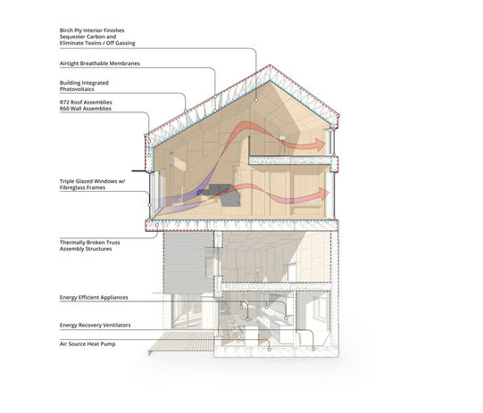 The Zero House project exemplifies New Wood Open Architecture through its flexible urban infill strategy and truly sustainable construction and ongoing operation. The 2-storey stacked townhouse unit can be deployed to suit various urban infill sites depending on unique neighbourhood characteristics and density. The system could be used to gently densify an established neighbourhood via laneway or garden suites or applied to a larger site, where multiple units are combined to create a row house typology. Within each two-storey unit, no load-bearing interior walls allow for a high degree of dweller participation in the programming and spatial organization of the dwelling. The loft space is intentionally designed to remain flexible to dwelling needs and can be easily changed throughout the building’s life. The project is committed to sustainability by targeting Net-zero energy use, net-zero construction waste, net-zero carbon footprint, and net-zero cost differential to comparable housing. Wood and other cellulose-based fibres emerged as ideal materials to meet these admirable goals. The prefabricated panels are framed with standard SPF lumber to form a deep wall cavity for which straw and cellulose insulation are inserted to increase the envelope's thermal performance. Rigid Wood fiberboard insulation was then applied as continuous exterior insulation. The Zero House project exemplifies New Wood Open Architecture through its flexible urban infill strategy that is responsive to various housing demands and neighbourhood characteristics. The units also exemplify New Wood Open Architecture by remaining open to individual house needs and commitment to genuinely sustainable construction and ongoing operation.
